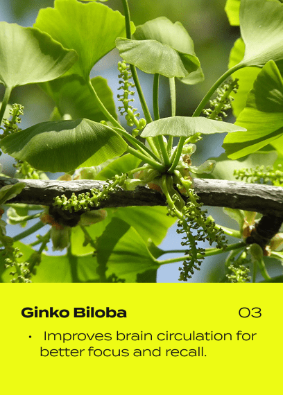 Enhances cerebral blood flow for faster recall, sharper focus, and increased oxygenation.